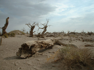 旅馆墙上有张旅游图,标出了各个景点在额旗的位置距离。主要景点有——东、西居延海,古居延城,大、小怪树林,黑城,红城子,神树,从一道桥到八道桥的胡杨林,还有原来已经干涸后经过国家调水而水量充沛的额济那高勒黑河(黑河)。第二天在街上找了辆仪征越野车,司机向师傅(0483--6521410)开车兼导游,带着我们先向黑城一线进发。今年到额旗比较幸运,左旗到额旗的路是新修的,从额旗到黑城的路也是刚压出来的(沙土路),我看到有人写去黑城很不容易,迷路、陷车是经常事还要带全球定位系统,所以来之前心里没底也不知道能不能找到黑城。还好我是个不折不扣的相信车到山前必有路的阿呆,到了“山前”发现一切迎刃而解。 向南走出镇子几公里后就会看到路前方的胡杨树,还有那在胡杨林中的蒙古包和用胡杨枝圈建的羊圈。再向前黑河突然就横担在我们面前。早知道黑河复流,可没想到居然有这么多水(要知道在内蒙地区所