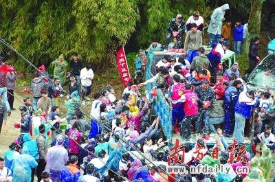 昨日,农历正月十三,是佛冈县高岗镇社岗下村传统的豆腐节。昨日,社岗下村再次聚集了乡里乡亲和外地游客,共度豆腐狂欢节(见上图)。 每年的豆腐节除了几百年的民俗民风,最吸引人的地方便是豆腐大战。社岗下村人一直信奉在节日这天被豆腐砸得越多,得到的福气也就越多,人丁会更加兴旺。因此每年会准备大量豆腐,在上灯仪式结束之后彼此之间便开始互掷豆腐。近几年越来越多的外地游客慕名在正月十三这一天来到社岗下村参与豆腐大战,祈求多福。 下午两时半,锣鼓声、鞭炮声响彻山村,豆腐大战正式打响。当地村民和外地游客拿起事先准备好的豆腐,互相投掷。不管认识不认识,先砸上一通。就算是事先准备好雨衣雨帽把自己严严实实包裹起来的村民,也被砸得一身白。没有太多防护措施的游客,更是被砸得从上到下都是豆腐。路过的汽车、甚至是警车也难躲豆腐的亲吻。今年刚刚添丁的村民更是被众人合力抬起来猛砸豆腐。不过,被砸得越多,意味着新年得到的福气也越多,众人也越是高兴。 |