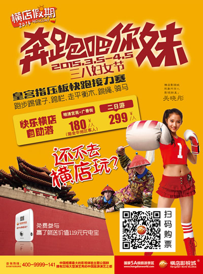 2015年春(3月5日至4月5日),《奔跑吧,兄弟》的同款游戏“奔跑吧,你妹”将在横店影视城明清宫苑举行。凡是在这期间前来游玩的团队和散客游客,都可以参与“皇宫指压板快跑接力赛”。在午门广场前,5条200米长的指压板赛道直接张扬地铺开,赛道上设置了5个障碍,只要完成全部项目,都可以获得纪念品一份。而每场比赛获得第一名的队伍还有其他大奖。活动虽简单,但贵在有趣健康,赤足踩踏指压板,不仅可以刺激足底穴位,疏通足底血脉经络,还可以锻炼足底肌肉,增强下肢的稳定性,十分有益于春季养生。相信跑完全程之后,你也很想喊一句,“你妹!太TM爽了!”