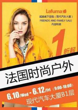 在这个拥有灿烂阳光的夏季,Lafuma为答谢广大消费者给予它的厚爱,举办本次“FRIENDS AND FAMILY SALE”内部特卖活动,震撼折扣,超值享受,优质服务,就在北京现代汽车大厦B1层,6月10日—6月12日(9:00—18:00)期待您的参加! |