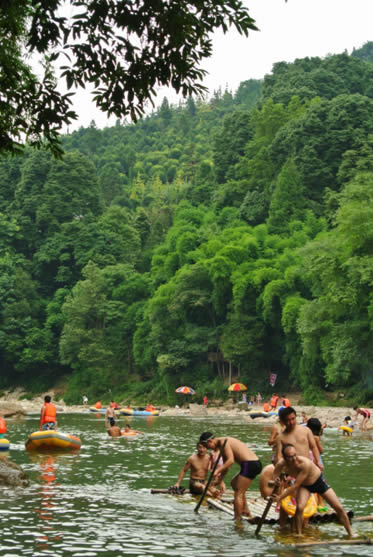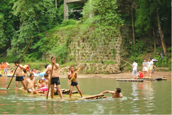 到了味江河道中下段,人开始多了起来,河里除了黄色的皮艇,还出现了很多竹筏,竹筏上的游客普遍比皮艇上的穿得清凉,这一切都是为了方便“耍水”。