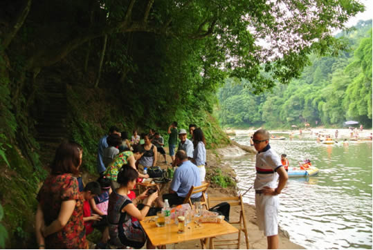 世界这么大,唯美景与美食不可辜负。在漂流河道尾段的河滩上,一条美食街沿河而生。包括啤酒、烧烤、茶水、甜品在内的10多类美食摊点交错分布,为这世外桃源般的深山河谷注入了食色人间的气息。小伙伴说,下次还要来体验一次特色的“夜漂”项目,漂完就上岸喝夜啤吃烧烤,这样才是享受。 注:1.因项目建设原因部分图片来自于水立方前身原“两河漂流”以及网络。 2.项目周边详细地图